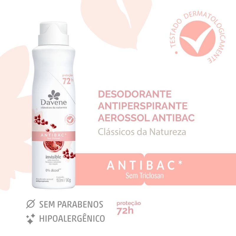 O Desodorante Antiperspirante Aerossol Clássicos da Natureza Antibac 150ml da Davene foi desenvolvido para proporcionar proteção eficaz contra o suor e os maus odores, mantendo as axilas secas e frescas durante todo o dia. Sua fórmula com ação antibacteriana combate as bactérias causadoras de odores, garantindo 48 horas de proteção antitranspirante e uma sensação de limpeza e frescura prolongada.