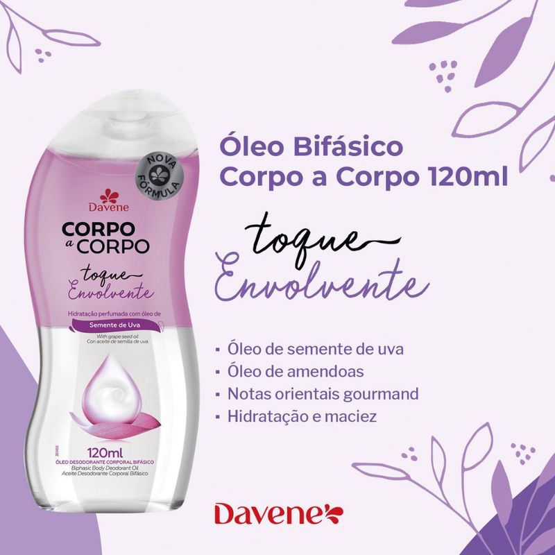 O Óleo Desodorante Corporal Corpo a Corpo Envolvente proporciona maciez e mantém a elasticidade da pele, deixando-a hidratada e levemente perfumada. Combina notas orientais gourmand sofisticadas, com o cuidado do óleo de amêndoas e semente de uva.